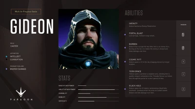 Gideon is a high-mobility Caster adept in wave clearing and burst damage. Using his abilities, Gideon can control fights and be a dominant threat with or without a team.
